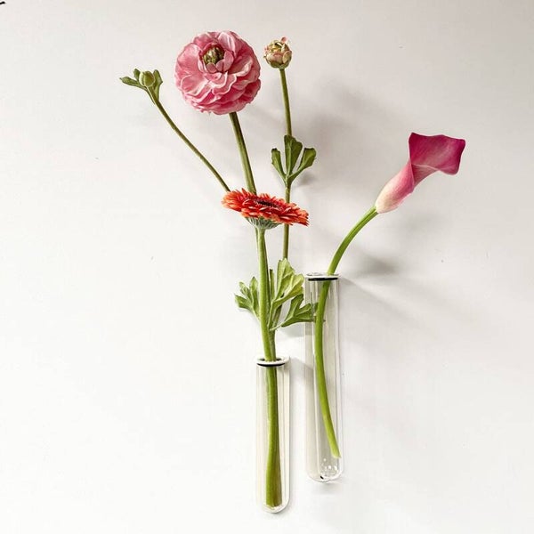 Deze bloemenvaasjes geven je muur meteen kleur en geur. Het glazen pipetvaasje hangt elegant in de stevige stalen, magnetische houder. Met een paar losse bloemen of de overblijvertjes van een groot boeket vrolijk je je muur helemaal op. Mooi als een stilleven met een magneetsticker als basis.