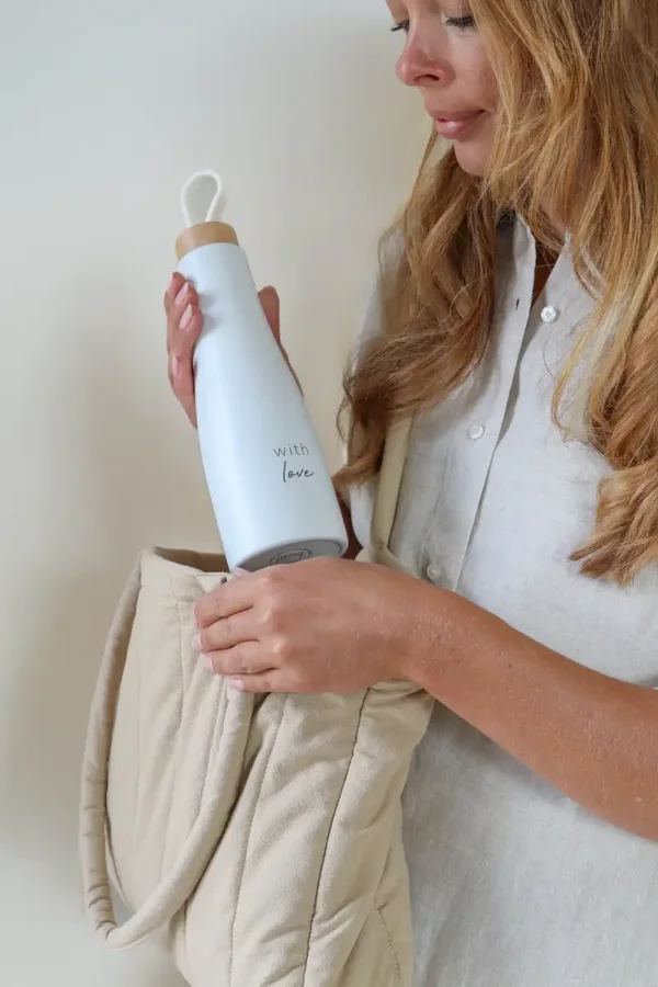 Mooie witte thermosfles met handig hengsel, om je drankje warm of koel in te houden. Inhoud 1 liter.